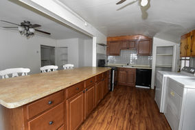 First floor has an open living area with upgraded flooring that extends to the kitchen with large center island .